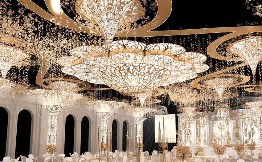 酒店婚礼堂的设计需要考虑多个方面,包括但不限于场地布置、仪式流程、餐饮服务、娱乐活动以及婚房的准备等。以下是一些关于酒店婚礼堂设计的建议: